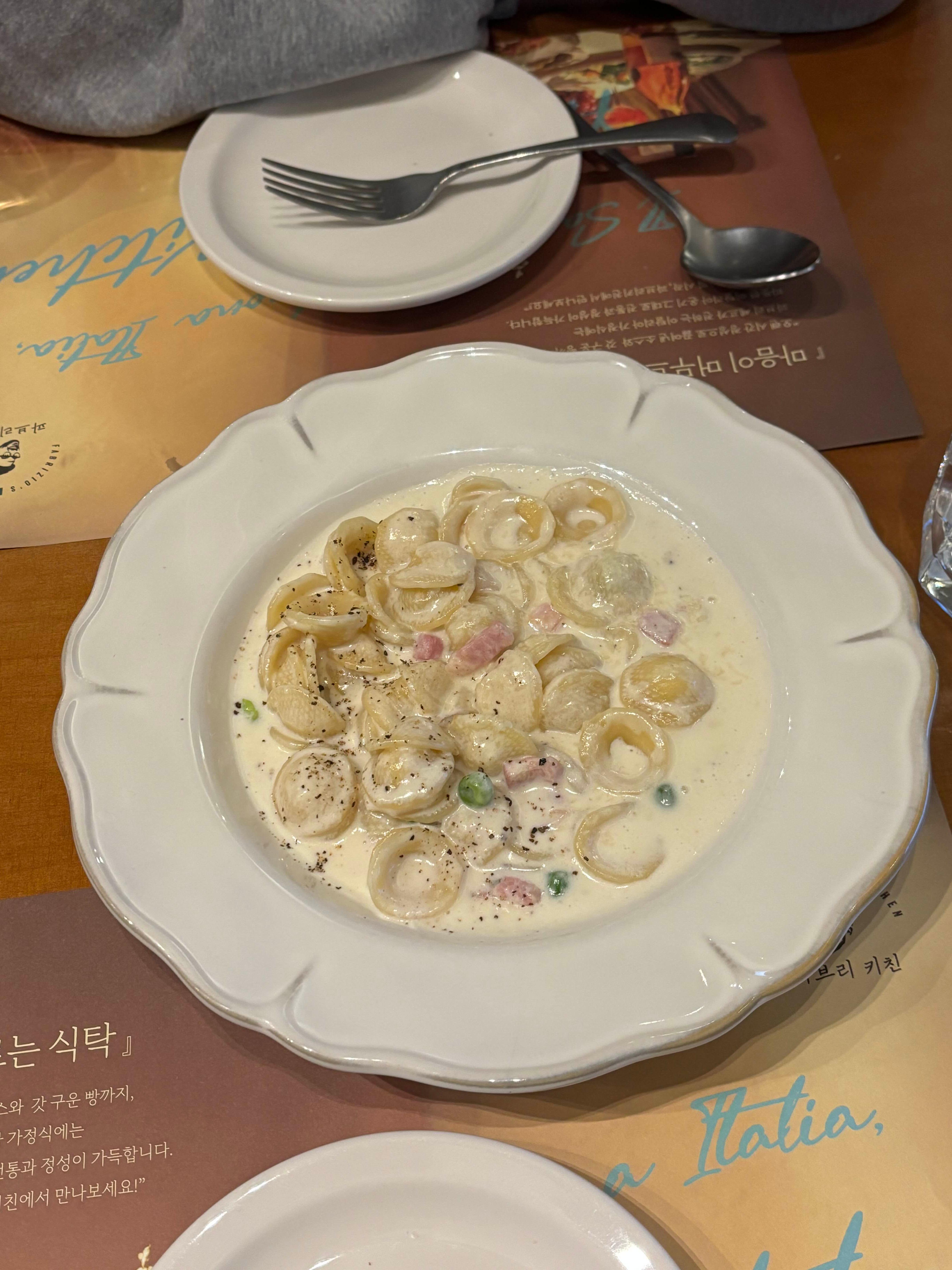 파스타는 처음 먹어 보는 종류였고 뇨끼와 수제비 사이 느낌?으로 식감이 꽤나 씹히는 단단한 파스타였습니다.