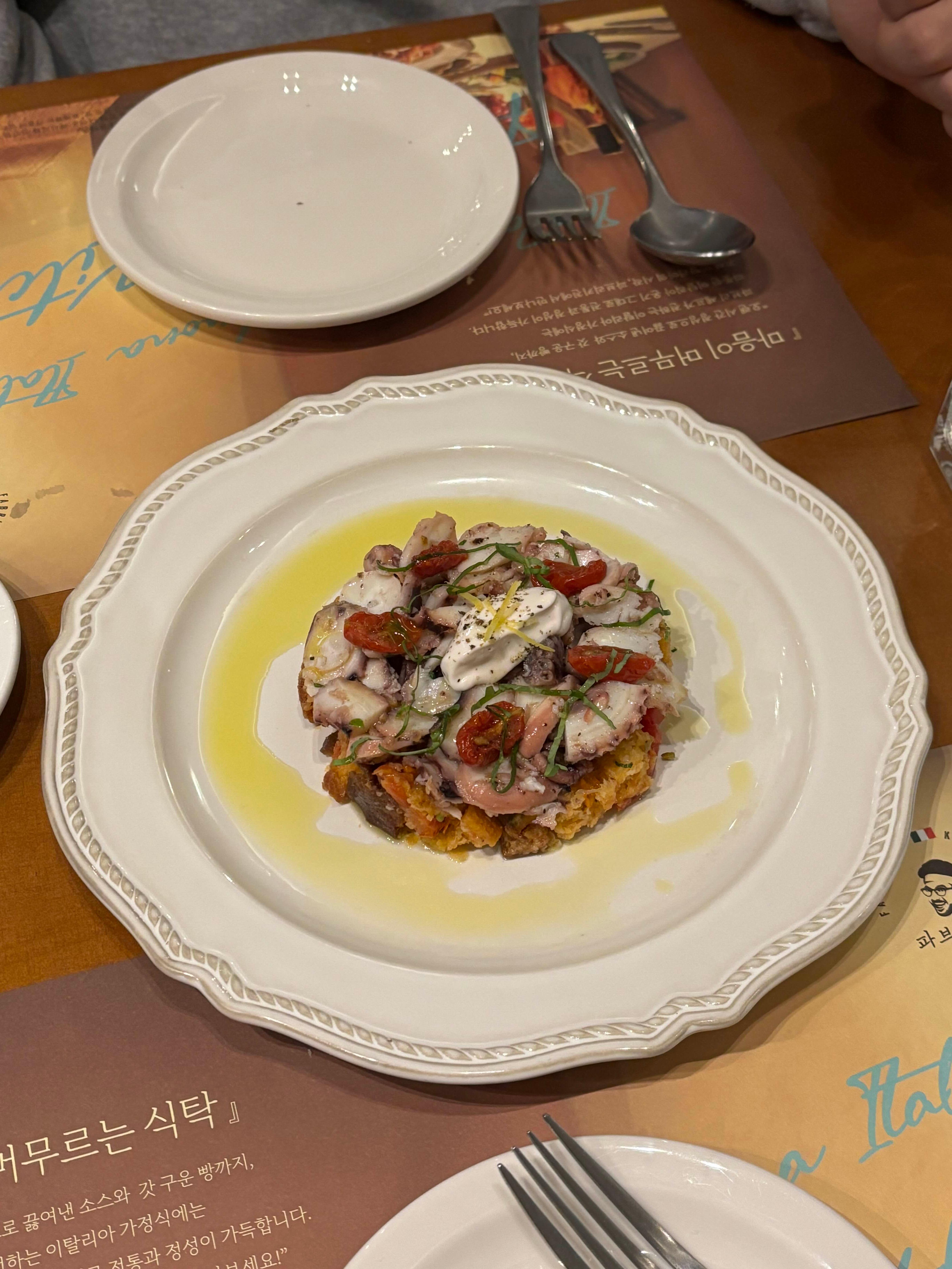 에피타이저로 시킨 샐러드는 바삭한(거의 딱딱) 식감이 같이 있고 문어는 엄청 부드러워서 극과극 식감에 새콤한 소스가 곁들여진 맛이었습니다.