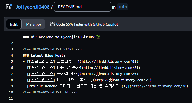 저번에 작성했던 update-readme.yml에서 5개의 최신 블로그 글을 작성하는 부분을 수정해야한다.